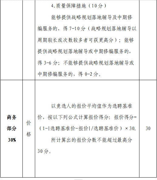 評(píng)審方式采用綜合評(píng)分法,由評(píng)審人員根據(jù)評(píng)分辦法(詳見(jiàn)第八條)進(jìn)行打分,并按照分?jǐn)?shù)由高到低順序確定中選單位,總分相同時(shí)按注冊(cè)資本金由高到低順序排名。